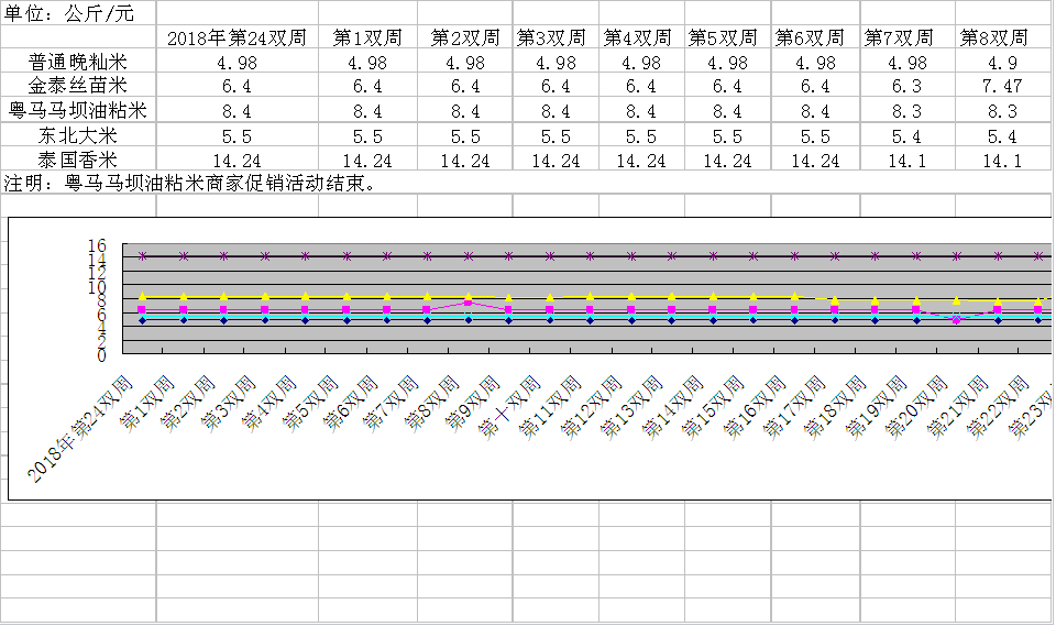 3、优质籼米类(粤马马坝油粘)零售格价格为9.6元/公斤,与上双周环比上升26.3%。(注明:优质籼米类(粤马马坝油粘)商家促销活动结束。)