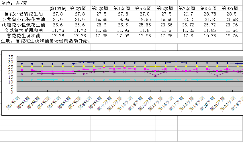 2、金龙鱼小包装花生油零售价格为23.98元/升,与上双周环比上升20%。(注明:金龙鱼小包装花生油商场促销活动结束。)