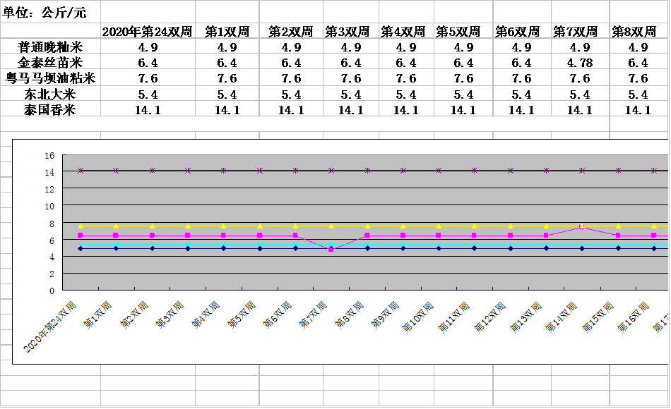 3、优质籼米类(粤马马坝油粘)零售格价格为7.6元/公斤,与上双周环比持平。