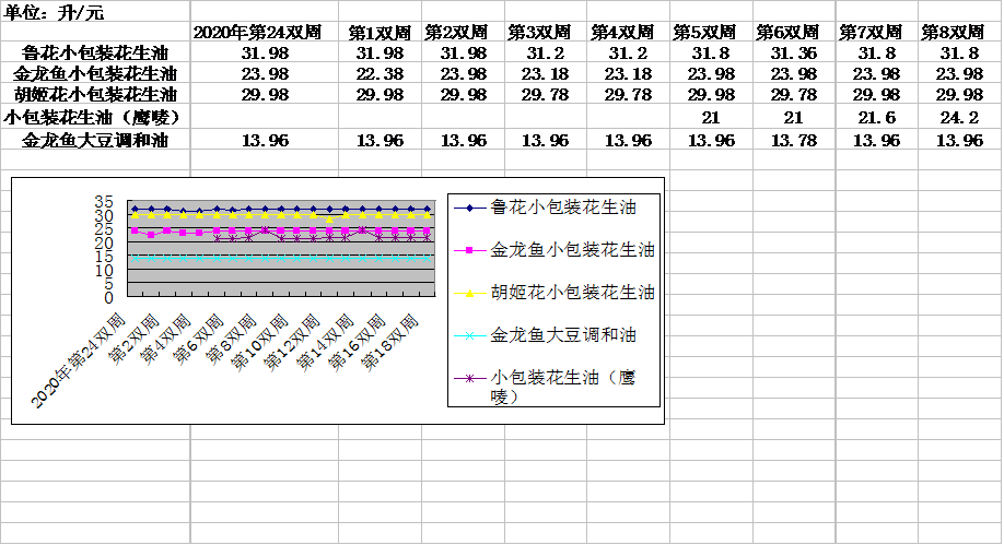3、胡姬花小包装花生油零售价格为29.98元/升,与上双周环比持平。