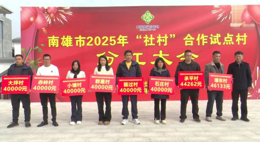 2026年2月5日,南雄市2025年“社村”合作试点村分红会议在水口镇篛过村举行,25个“社村”合作试点村分红100万元。各试点村代表怀着期盼与喜悦,接过沉甸甸的分红款,共同见证集体经济发展的丰硕成果,共享“社村”合作改革的甜蜜果实。韶关市供销社理事会副主任祝雄辉,南雄市委常委、办公室主任石为参加活动。