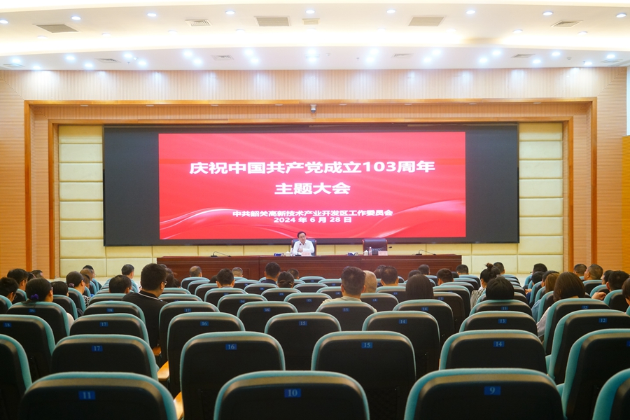 为进一步激励高新区广大党员干部在新时代新担当、新作为,更好地发挥基层党组织战斗堡垒作用和党员先锋模范作用,在中国共产党成立103周年之际,韶关高新区召开庆祝中国共产党成立103周年主题大会。广大党员干部集体观看了中组部专题节目《榜样8》和韶关高新区专题片《新星》。市政府党组成员、副市长、高新区党工委书记肖智勇围绕“以党纪学习教育实效护航高新区高质量发展”主题讲授党课。高新区管委会和所属单位党员代表,以及两新党组织党员代表参加主题大会。