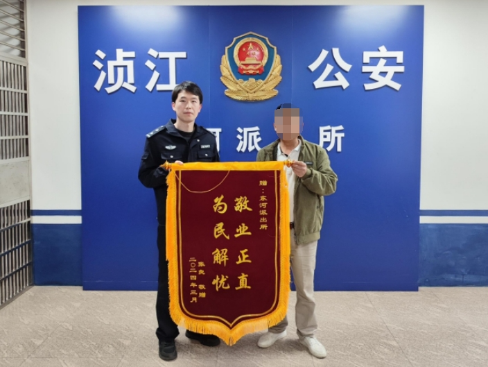 日前,市民张先生将一面印有“敬业正直 为民解忧”的锦旗赠予韶关市公安局浈江分局东河派出所,感谢民警帮忙追赃挽损。