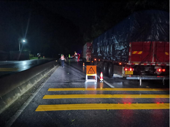 2022年6月18日16时22分,新丰县国道G220线K2381+000(板岭路段)发生上边坡山体崩塌约5000立方,造成交通中断。因现场雨势较大,天色已晚,边坡土方不断滑落,地质状况不稳定,现场已做好围蔽,摆好标志牌警示。经过工作人员的全力抢修,于6月19日18时36分已清理出半幅路面。