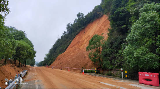 2022年6月18日17时12分,新丰县国道G105线K2412+500南行(徐坑村路段)发生上边坡山体崩塌约2500立方,未造成交通中断。因现场雨势较大,天色已晚,边坡土方不断滑落,地质状况不稳定,结合气象部门预警18日夜间到19日新丰县有暴雨到大暴雨,抢修难度较大。当晚,韶关市新丰公路事务中心已组织人员在现场按照规范设置安全警示标志牌。