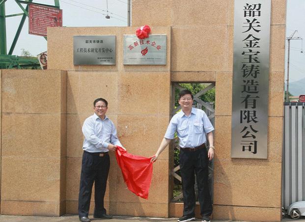 5月13日,韶铸集团下属企业韶关金宝铸造有限公司(以下简称金宝公司)隆重举行国家“高新技术企业”挂牌仪式。挂牌仪式由韶铸集团副总经理、金宝公司总经理马陆主持,韶铸集团总工程师徐尔灵、金宝公司技术总监苏建勇共同揭牌,韶铸集团技术开发中心、人事保卫部、金宝公司全体管理干部参加挂牌仪式。