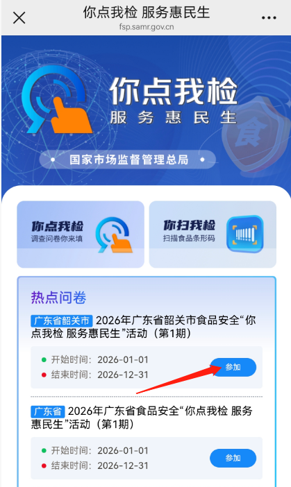 为切实增强消费者对食品抽检工作的参与感与体验感,精准发现并消除食品安全风险隐患,根据2026年全市食品抽检工作部署,市市场监督管理局即日起正式启动韶关市“你点我检服务惠民生”常态化食品抽检信息问卷征集活动。