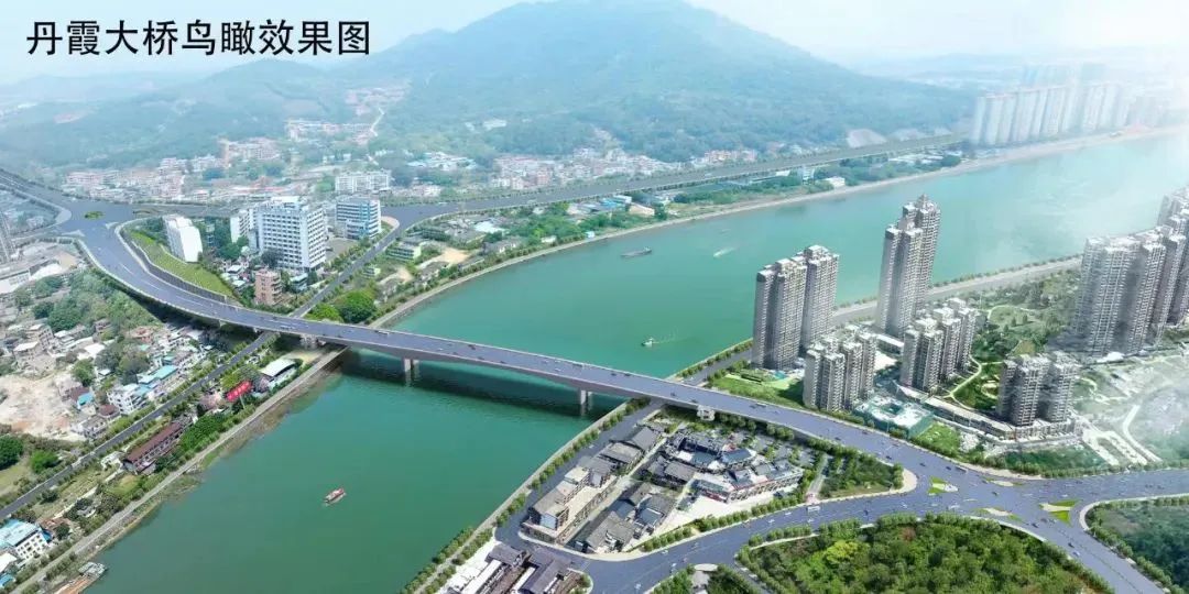丹霞大桥位于韶关奥园旅游文化城附近,线路呈南北走向,南起与朝阳路平交处,向北跨越武江后,止于十里亭大道转盘附近。项目路线全长约937米,主桥采用连续钢构桥型,全线按双向六车道标准建设,同步建设桥梁、道路、给排水、照明、通信、交通、监控及绿化等附属设施。