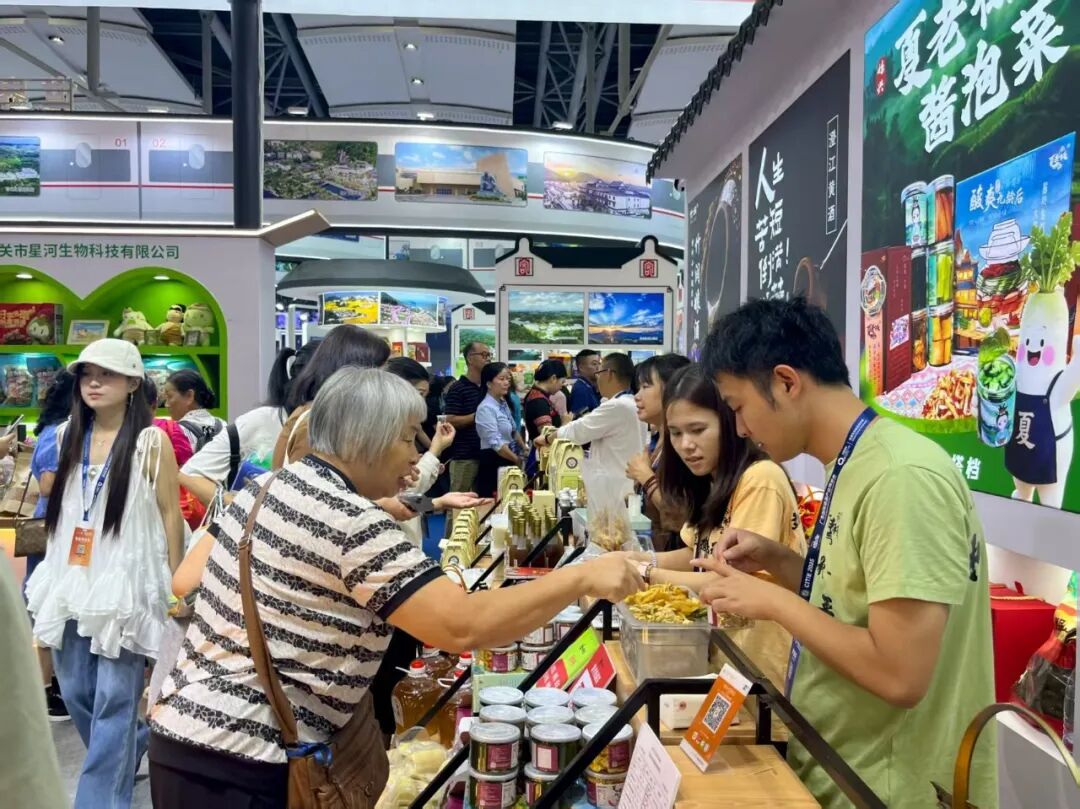 韶关展区以“非遗+科技+文旅”创新融合模式引爆关注,实现好物热销与文化传播双突破。特色美食试吃区人气爆棚。丹霞柴火红豆月饼古法手工制作,韶州联名大米颗粒饱满,竹润娘酒、澄江黄酒等非遗佳酿,与韶美客家米酒系列(桂花酒、玫瑰酒、枇杷酒)香甜醇美,翁源客家米饼酥香松脆,乳源瑶家金线莲养生茶、韶信辣椒酱、夏老板泡菜等,多款农特产品可试喝试吃,吸引观众驻足。