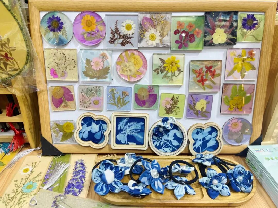精品文创区亮点纷呈。科艺公司推出风度阁微缩模型、榫卯八音盒,十步芳草园展示蓝晒系列与香草手工皂,翁源兰花打造沉浸式花艺空间,呈现“兰花+文旅+电商”产业新形态,星河生物呈现菌菇制品,体现现代农业科技成就,南雄珠玑古巷姓氏文创(铜彩书签、陶瓷茶杯)彰显千年底蕴。