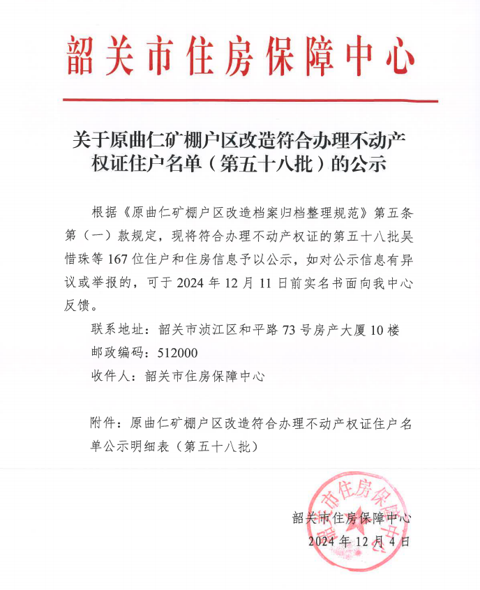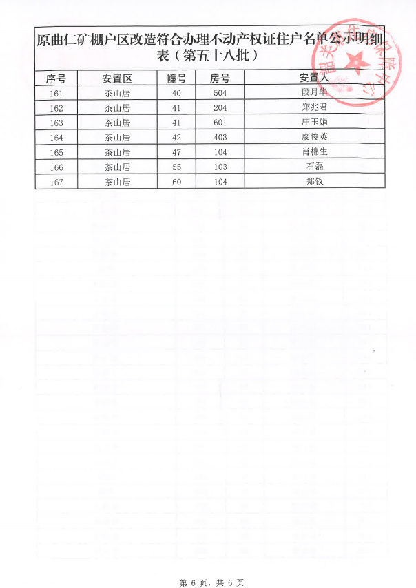 关于原曲仁矿棚户区改造符合办理不动产权证住户名单(第五十八批)的公示