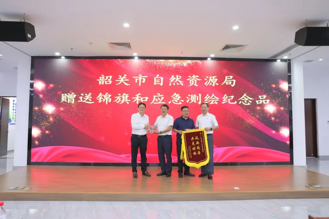 签约仪式后,韶关局向省测绘院赠送了锦旗和应急测绘纪念品,对省测绘院参与韶关市防汛救灾工作中做出的积极贡献再次表示感谢,并对省测绘院技术人员的专业能力予以充分肯定。