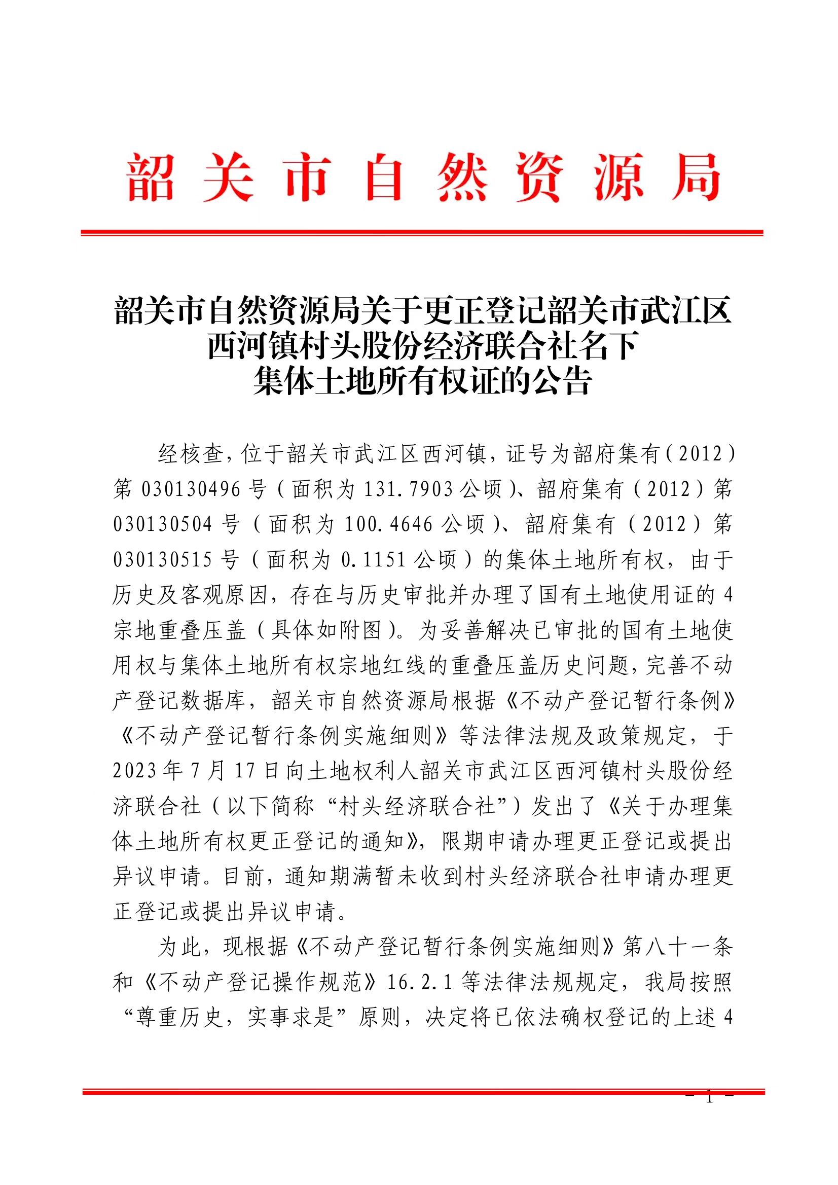 韶关市自然资源局关于更正登记韶关市武江区西河镇村头股份经济联合社名下集体土地所有权证的公告.pdf