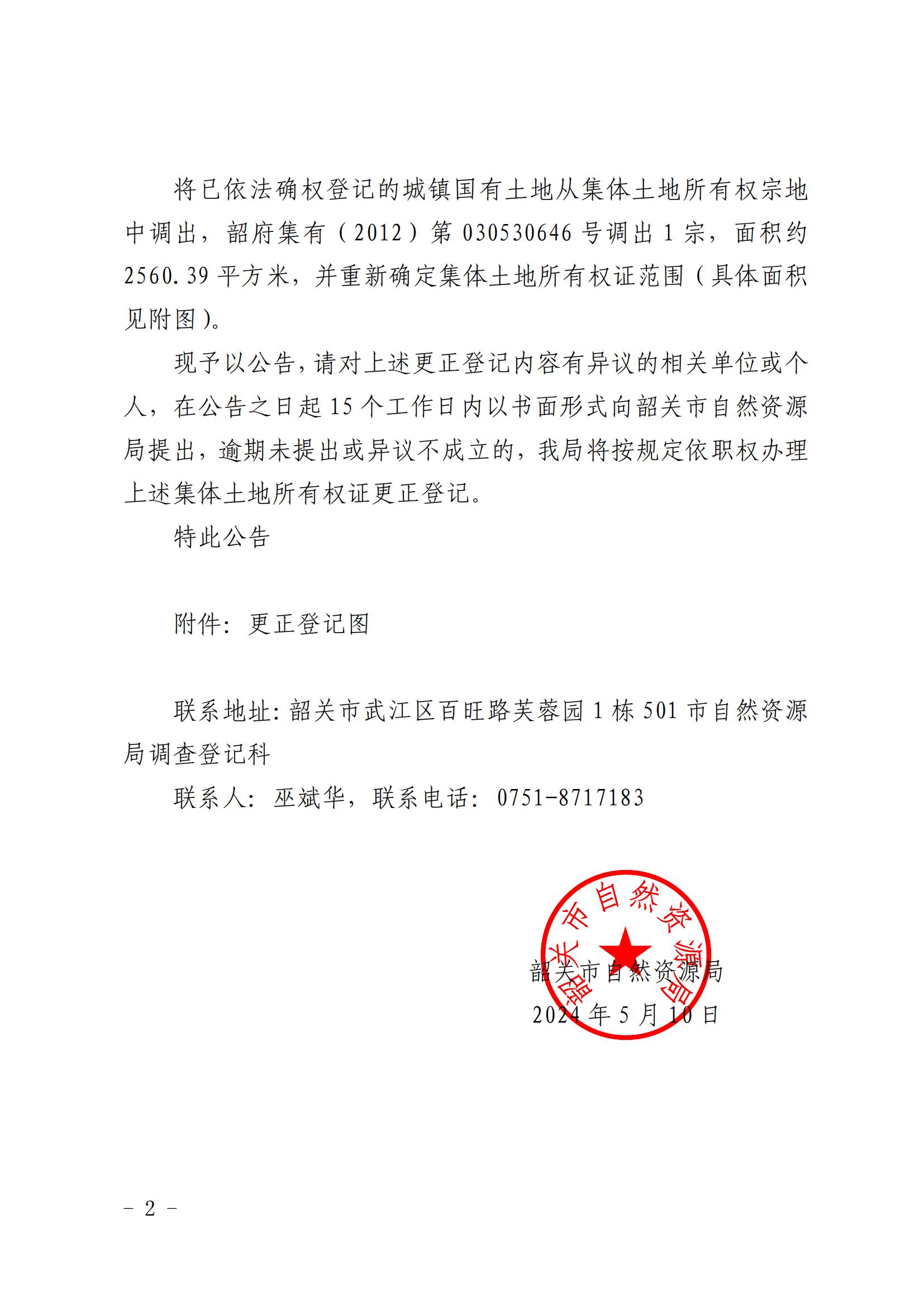 韶关市自然资源局关于更正登记韶关市武江区重阳镇大夫前村新村一队经济合作社等农民集体名下集体土地所有权证的公告.pdf