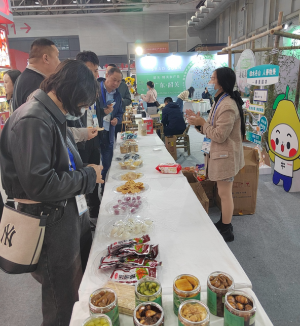 在农交会上的千县万品商务推介专场活动中,N2展区“善美韶农”韶关精美农产品推介沙龙活动现场,人头攒动,气氛火热。“韶关兰花”“韶关食用菌”“韶关珍果”“韶关茶”等近百款韶关“土特产”吸引众多采购商和消费者,参观品鉴人员络绎不绝。