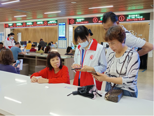 (上图为高峰时段帮办代办志愿者到等候区开展导办预审工作)