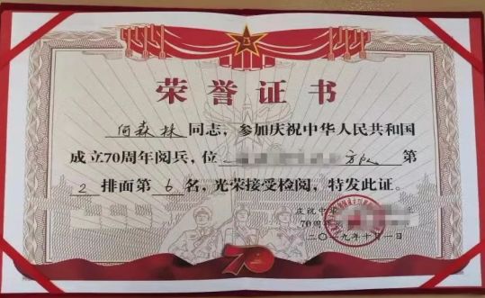来自曲江区马坝镇水文村委的何森林同志,现为南部战区海军某训练基地下士。在开始阅兵队员选拔后,每天10余个小时的高强度训练,唯一的目标就是成为阅兵队伍中的正式队员。为了使军姿更标准,何森林常常在晚上睡觉时用绳子将自己的膝盖绑稳固定。即使训练结束,也要加班加练,大家都流传着这样的口号“宁可脱掉三层皮也要见到习主席”。经过6个月的魔鬼训练,在今年10月1日,何森林终于实现了自己的阅兵梦。