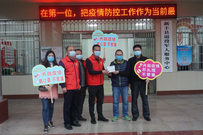 热心的退役军人志愿者赠送100个口罩给新丰县退役军人服务中心工作人员。