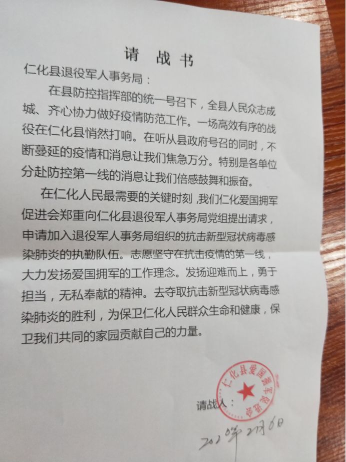 【仁化】县爱国拥军促进会向县退役军人事务局党组提交《请战书》,要求加入到抗击疫情的战斗中去。目前仁化县共有302名退役军人活跃在疫情防控的各个岗位。