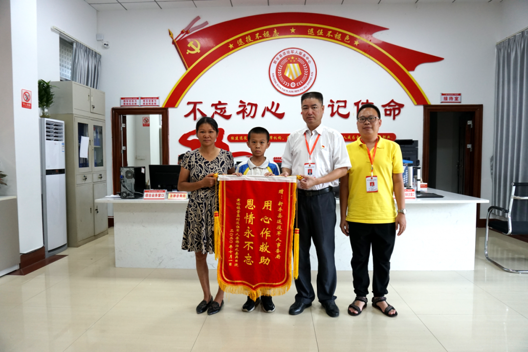 7月17日下午,退役军人廖某的妻子吴某带着读初一的儿子,专程从黄磜镇来到新丰县,将一面印有“用心作救助 恩情永不忘”字样的锦旗送到新丰县退役军人事务局,对该局的帮助表示感谢。 据悉,廖某,39岁,系韶关市新丰县一名退役军人,于2019年突发脑出血入院治疗,自负部分的医疗费用高,造成整个家庭基本生活严重困难,在申请过程中,廖某不幸病故。 2019年12月,廖某家人通过韶关市新丰县黄磜镇退役军人服务站了解到了广东省退役军人应急救助资金(以下简称“救助资金”),并在县、镇、村退役军人服务中心(站)工作人员的帮助下申请了救助资金,经过应急救助资金审批流程,6万2千多元救助资金送到了廖某家人的手中,及时缓解了家庭困难。为了表达感激之情,廖某家人专门制作了锦旗赠送给该县退役军人事务局:“千言万语不知从何说起,唯有感谢二字,非常感谢退役军人事务部门的帮助,救我们于水火之中。”说到这里廖某家人流下了感动的泪水,同时表示:“今天带上儿子前来赠送锦旗是希望他要学会感恩,长大后有能力了也要为社会作贡献,回报社会,才不辜负现在大家对我们的帮助。” 据统计,2019年10月《广东省退役军人应急救助资金管理暂行办法》实施以来,该县共有3名退役军人共获得13多万元救助资金,大大缓解了该县退役军人因重大疾病引发的家庭经济困难。救助资金适用于符合条件的退役军人及其他优抚对象,是退役军人在享受普惠性社会保障政策后的一次性帮扶援助,极大程度上体现了党和政府对退役军人的关心关爱。