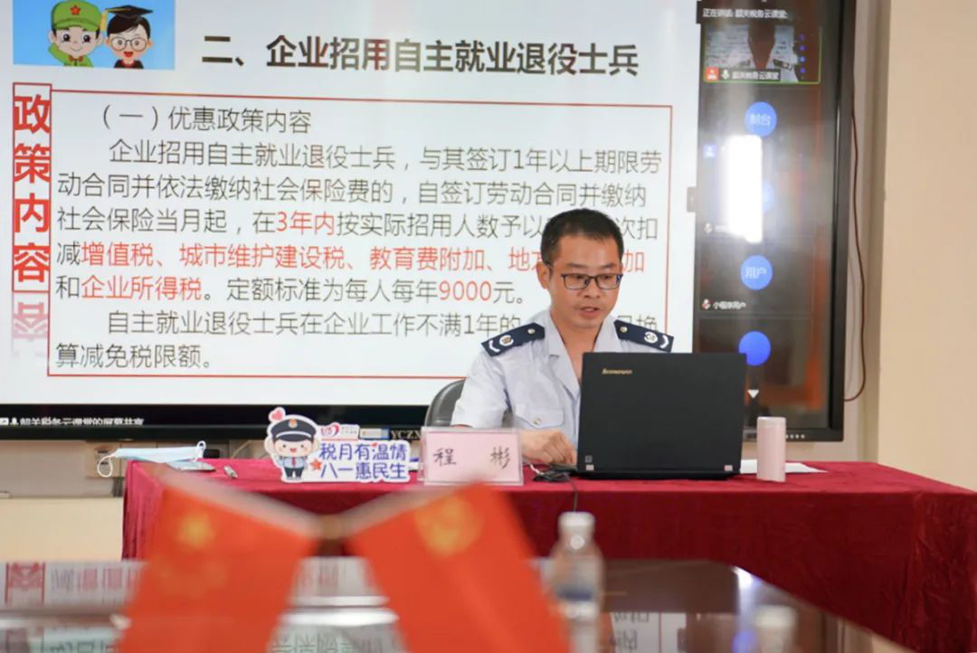 为进一步促进退役军人创业就业,确保退役军人尽享税费优惠政策红利,7月31日,韶关市退役军人事务局联合国家税务总局韶关市税务局举办“税月有温情 八一惠民生”退役士兵创业就业税费政策线上宣讲活动,实现“不见面”的精准政策辅导。