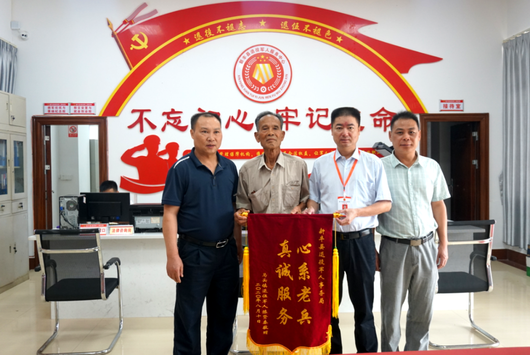 8月17日,韶关市新丰县退役军人事务局通过省厅评残共17名老兵,陆续到退役军人服务中心大厅领取《中华人民共和国残疾军人证》,马头镇退役老兵陈某前来赠送锦旗,以表感谢。