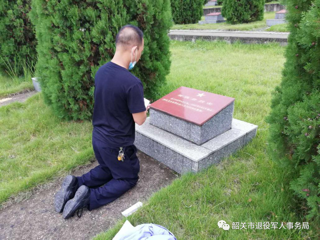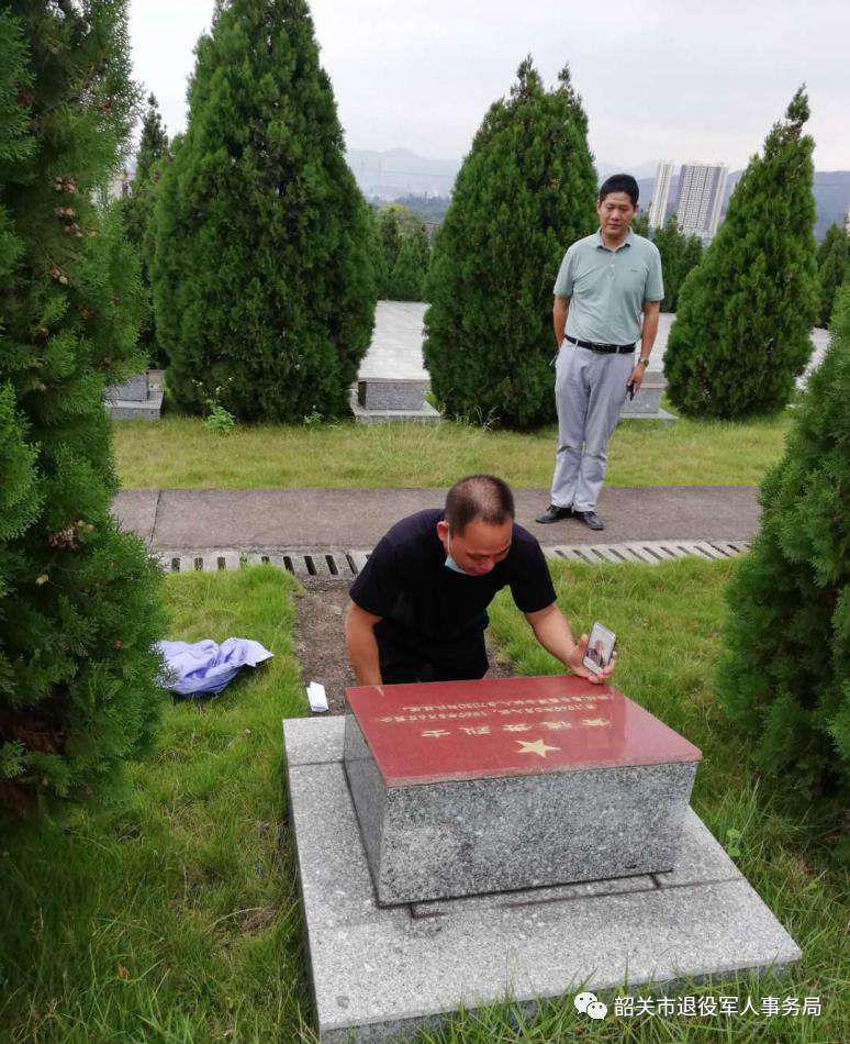 50多年前,叔叔黄德贵牺牲时,黄生树还没有出生。 50多年来,黄德贵的母亲,对儿子一直念念不忘。 50多年后,抚摸着叔叔的墓碑,黄生树声音哽咽激动:终于帮奶奶找到了叔叔,了却了奶奶的心愿。 据悉,黄德贵,男,原广东省惠来县葵潭公社人,1969年3月入伍,系原韶关市曲江县马坝镇7030部队战士。1969年8月6日,不幸因公牺牲,当时埋葬在曲江区马坝镇画眉山上。 50多年来,烈士黄德贵的妈妈一直牵挂儿子的下落,作为侄子的黄生树从小就听着叔叔黄德贵的故事长大,直到2013年奶奶去世时也一再叮嘱他,一定要找到叔叔的墓地并告诉她,好让她放心地走。 念念不忘,必有回响 9月25日下午,黄生树出差到韶关,抱着不放过一丝希望的心态,他抽出时间来到了曲江,在一名路人的指引下,他来到了曲江区退役军人事务局,刚好见到金梅英局长,由于金局长做优抚工作时间长,她很快就核定了黄德贵烈士的安放地,并让工作人员带着黄生树来到了曲江区烈士墓园,找到了已安放在新墓园的叔叔黄德贵之墓。 激动万分的他,立刻掏出手机里烈士母亲的遗像,告知奶奶已牺牲50多年的叔叔黄德贵终于“找到了”,放下手机的那一刻,黄生树放声大哭。千里祭扫终如愿。那段被时空遮掩多年的血脉亲情,终于在此刻被连上了。 烈士虽去英灵在,松柏自有后人栽 2013年零散烈士普查工作开展以来,曲江区委、区政府高度重视这项工作,建成了曲江区烈士墓园,把零散烈士迁入墓园统一管理。修缮了罗坑镇、白土镇、小坑镇等烈士纪念碑设施,在重大节日开展纪念活动。每年9月,曲江区在革命烈士陵园举行公祭活动,深切缅怀革命烈士,传承弘扬英烈精神,让烈士精神代代相传,发扬光大。