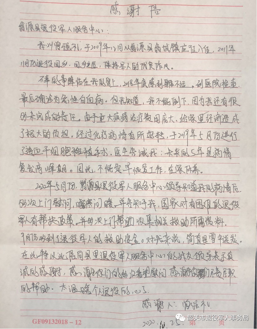 “得重病是一件不幸的事,但应急救助资金就如那夜空中最亮的星,点燃了我对新生活的希望。”10月25日,韶关市翁源籍退役军人曾强礼用一纸感谢信,情真意切地感谢给他送上应急救助资金政策的翁源县退役军人事务局和翁源县退役军人服务中心。
