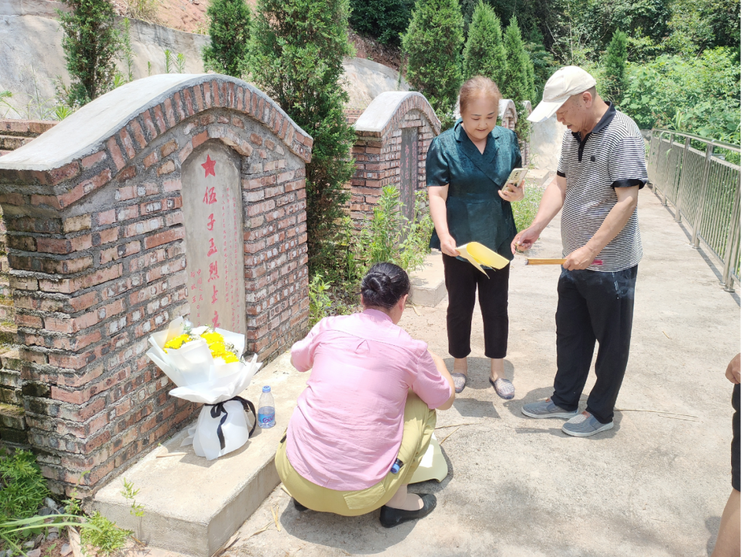 在伍子玉烈士的墓碑前,一场简朴而庄重的认亲祭扫仪式缓缓拉开帷幕。吴先生夫妇小心翼翼地献上精心准备的鲜花。紧接着,全场肃立,默哀致敬,时间仿佛在这一刻凝固,唯有对英烈的敬仰与哀思在空气中静静流淌。“舅舅,我们终于找到您了。母亲年事已高,无法亲自前来,嘱托我们来看您,家里一切安好”,吴先生哽咽着说,“我妈、姨妈年龄大了,便由我们表兄妹夫妇代表家人来祭拜。真的特别感谢始兴县、湖南省通道县两地退役军人事务局,是你们的不懈努力,让我们了却了长辈们多年的心愿,让这份跨越半个多世纪的亲情得以延续。”