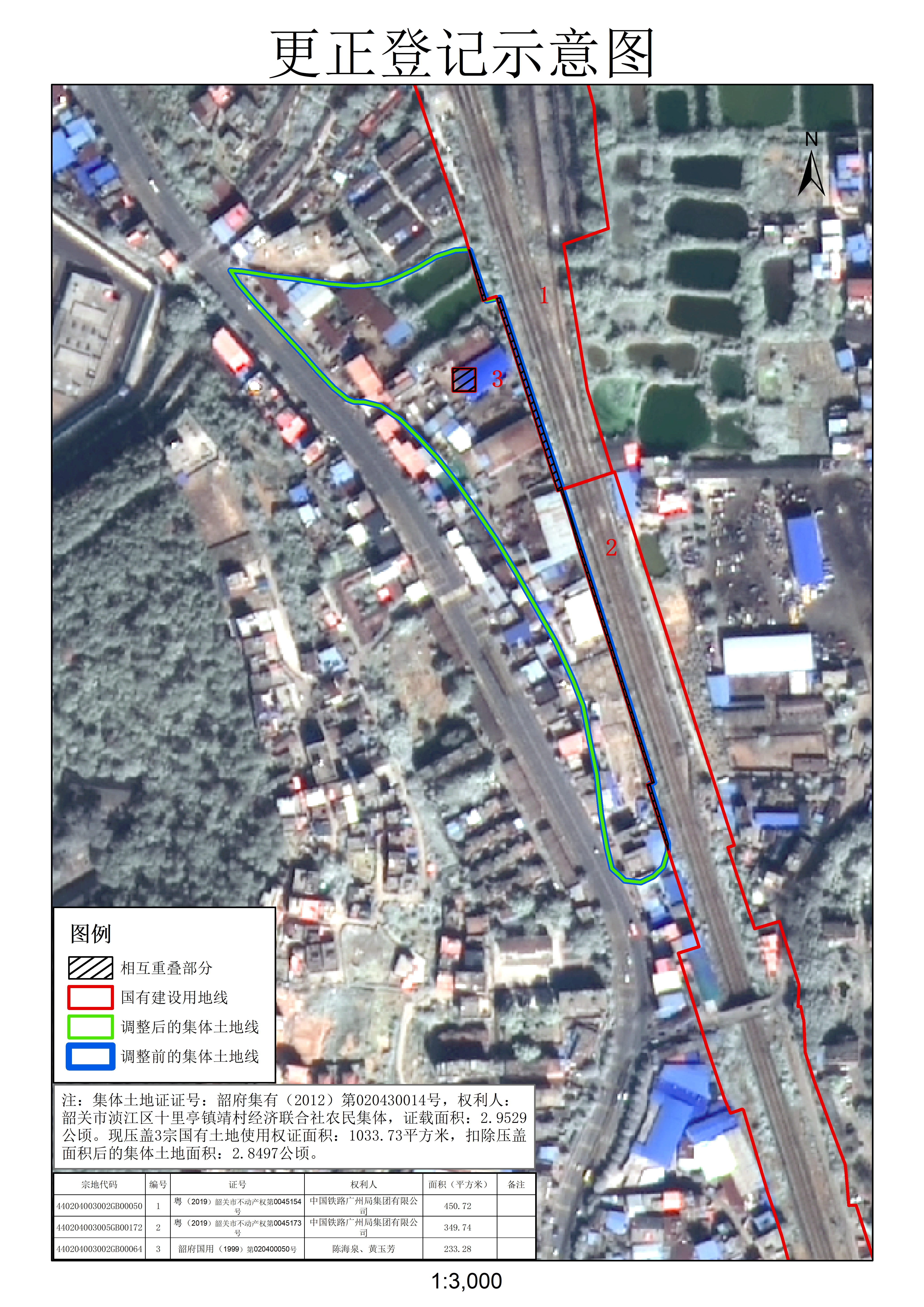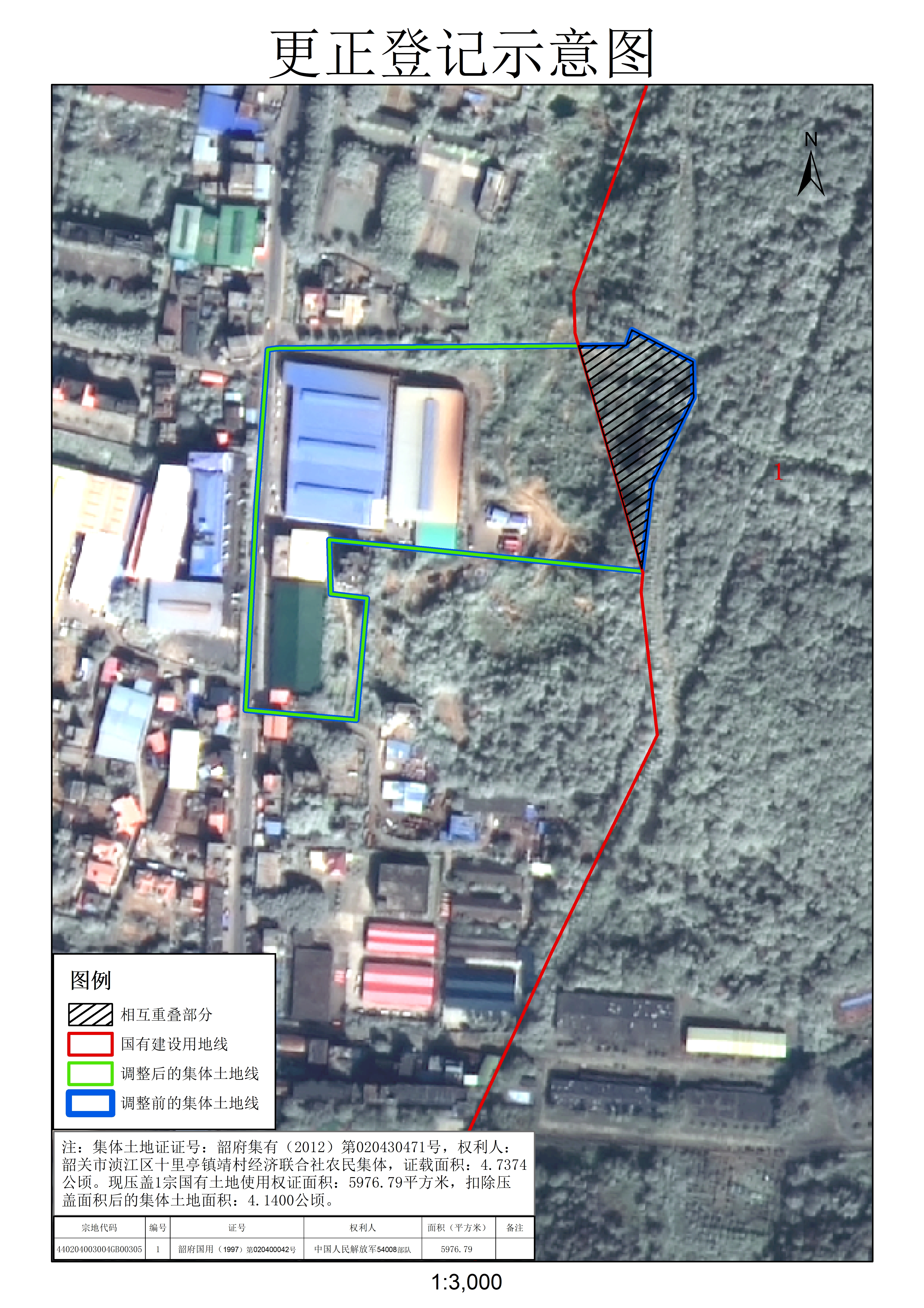 经核查,登记在你们名下坐落于浈江区十里亭镇,证号为韶府集有(2012)第020430014号(面积为2.9529公顷)、韶府集有(2012)第020430471号(面积为4.7374公顷)的集体土地所有权,存在与历史审批并办理了国有土地使用证重叠压盖(具体如附图)。为妥善解决已审批的国有土地使用权与集体土地所有权宗地红线的重叠压盖历史问题,完善不动产登记数据库,韶关市自然资源局根据《不动产登记暂行条例》《不动产登记暂行条例实施细则》等法律法规及政策规定,于2025年9月26日向土地权利人韶关市浈江区十里亭镇靖村经济联合社(以下简称“靖村经济联合社”)发出了《关于办理集体土地所有权更正登记的通知》,限期申请办理更正登记或提出异议申请。目前,通知期满暂未收到靖村经济联合社申请办理更正登记或提出异议申请。