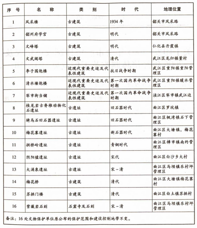 一、 本次重新核定公布的韶关市文物保护单位共16处。