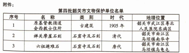 根据《中华人民共和国文物保护法》的有关要求,为加强我市文物的 保护和利用,现核定3处具有一定历史价值、艺术价值、科学价值的民居、 宗教类建筑为第四批韶关市文物保护单位,并予公布。