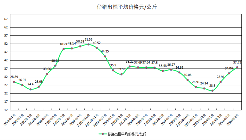 据农业农村部养殖场直联直报信息平台价格监测点数据,2024年4月,仔猪出栏平均价格37.73元/公斤,环比上涨10.78%,同比持平。