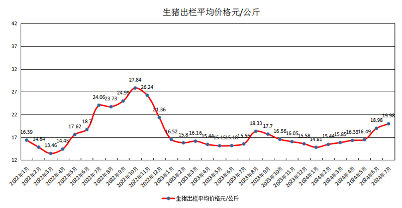 据农业农村部养殖场直联直报信息平台价格监测点数据,2024年7月,生猪出栏平均价格19.98元/公斤,环比上涨5.27%,同比上涨28.41%。