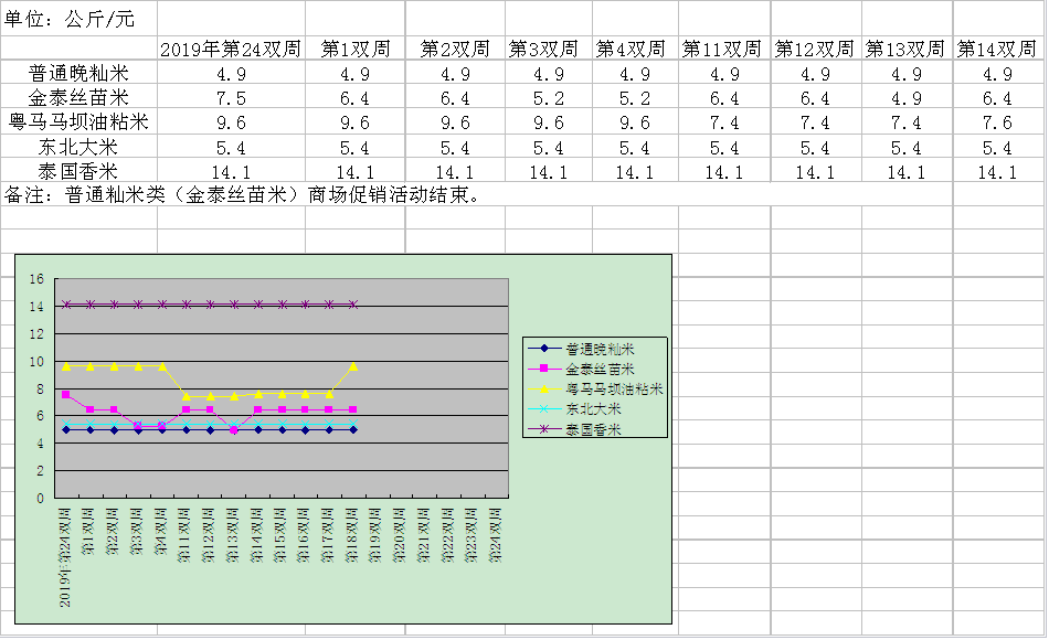 中秋国庆前夕,省内成品粮油供应正常,价格波动较小;早稻收购价涨至年度高位;港口饲料用粮库存充足,其中进口粮食占比较高。国内方面,国家发展改革委公布2021年粮食进口配额,小麦、玉米和大米配额均与上年持平;玉米新粮陆续上市、进口大增;需求旺盛,大豆单周压榨量创历史新高,豆粕、豆油价格有所上涨。国际方面,大米价格总体弱势;美国小麦、玉米、大豆价格走高后回落,呈倒“V”形走势,其中小麦出口强劲推动其价格上涨。 2020年第18期双周粮油市场大米零售价和食用油零售价变化不大。 一、市内主要大米品种价格具体变化情况 1、普通晚籼米零售格价格为4.9元/公斤,与上双周环比持平。 2、普通籼米类(金泰丝苗米)零售价格为6.4元/公斤,与上双周环比持平。 3、优质籼米类(粤马马坝油粘)零售格价格为9.6元/公斤,与上双周环比上升26.3%。(注明:优质籼米类(粤马马坝油粘)商场促销活动结束。) 4、粳米(东北米)零售价格为5.4元/公斤,与上双周环比持平。 5、泰国香米零售价格为14.1元/公斤,与上双周环比持平。 附大米曲线走势图如下: