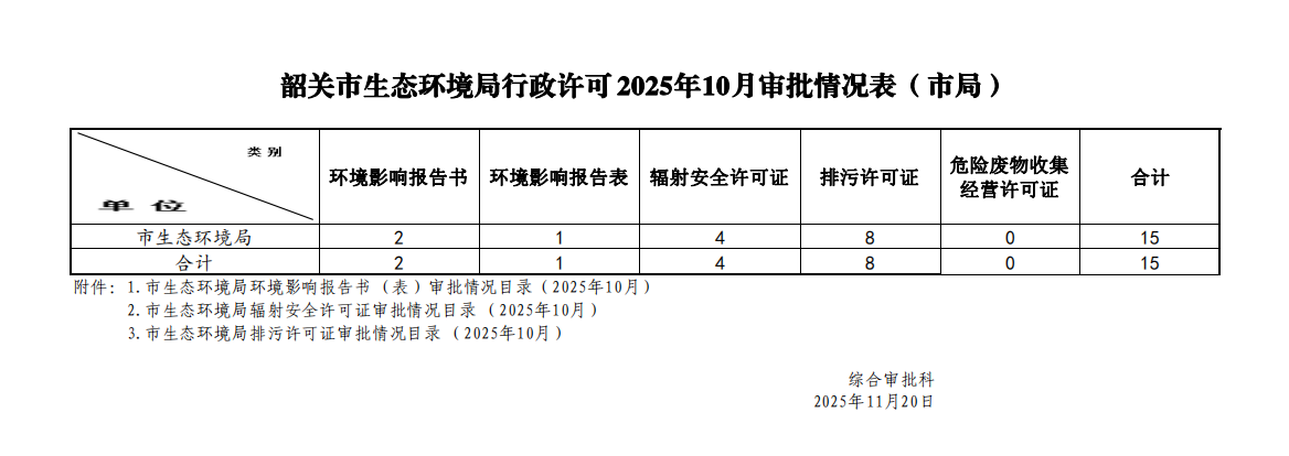 韶关市生态环境局行政许可2025年10月业务审批情况表