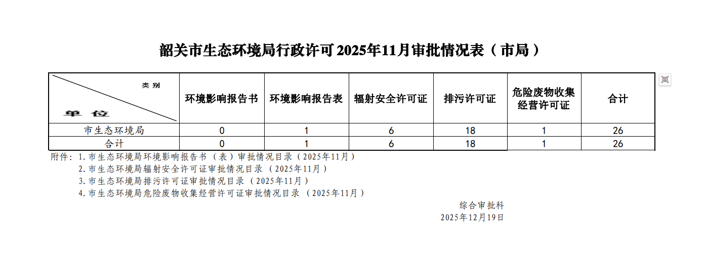 韶关市生态环境局行政许可2025年11月业务审批情况表