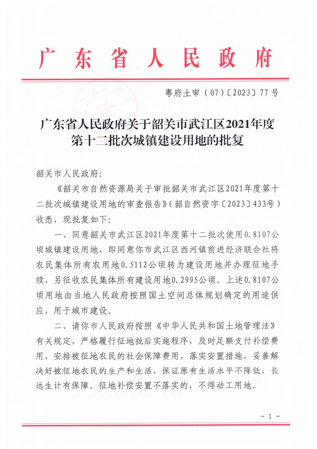广东省人民政府关于韶关市武江区2021年度第十二批次城镇建设用地的批复.pdf