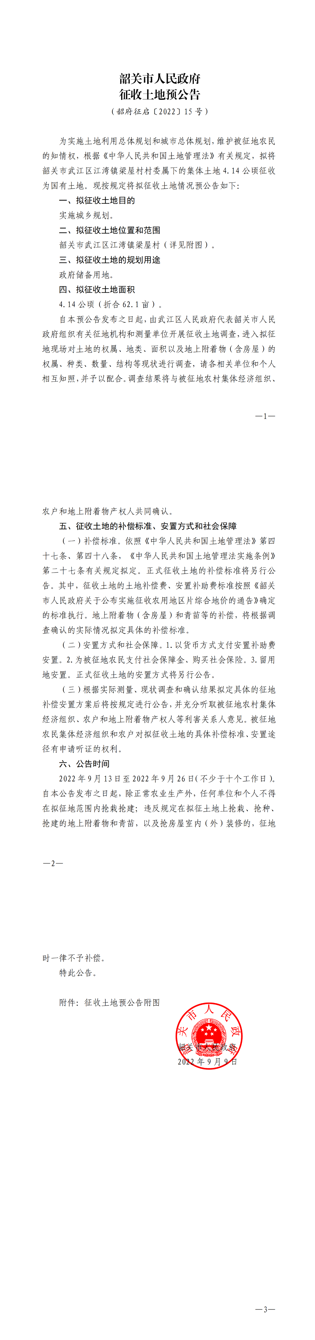 韶关市人民政府征收土地预公告(韶府征启〔2022〕15 号)