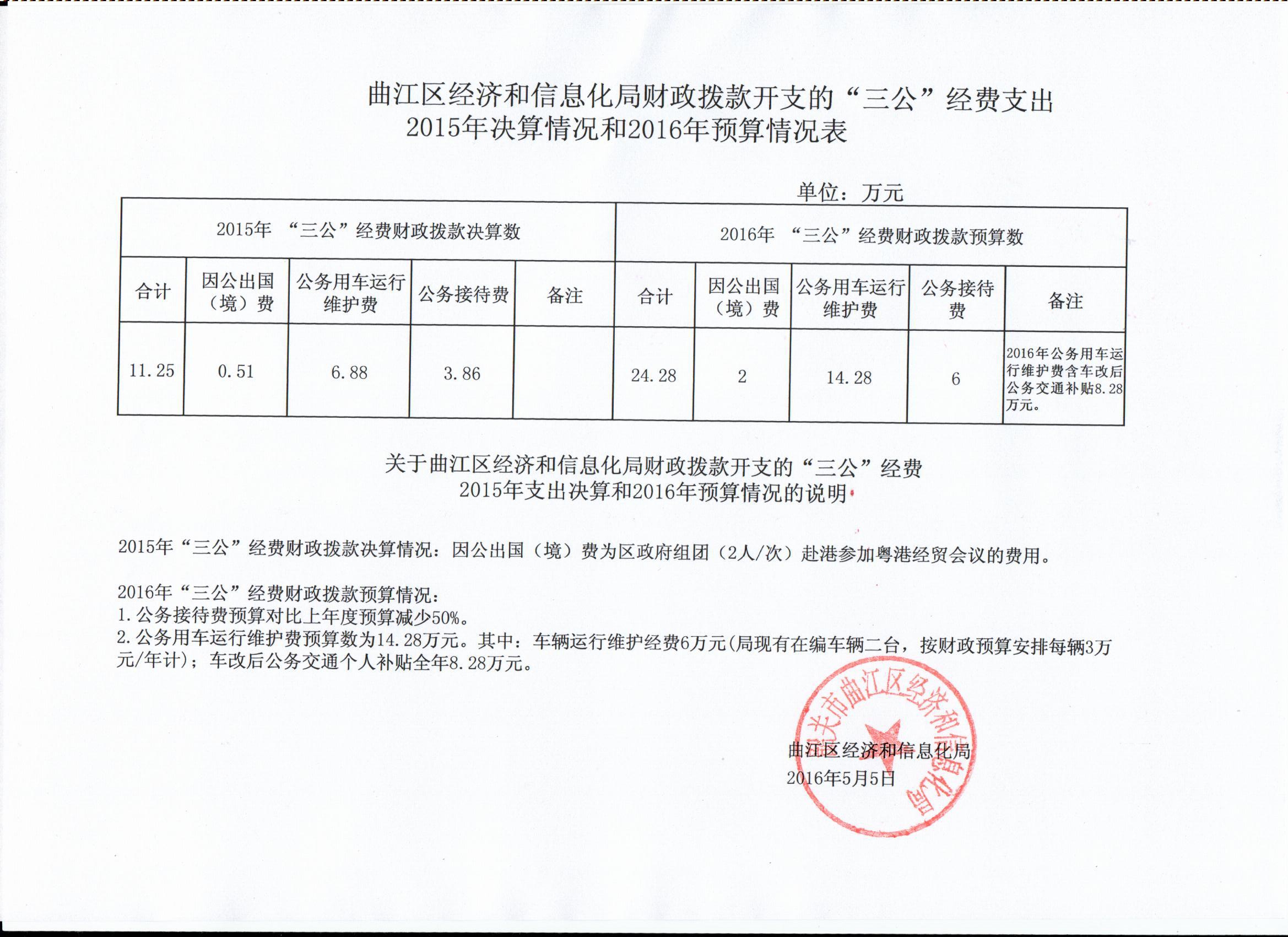 区经信局财政拨款开支的“三公”经费支出2015年决算情况和2016年预算情况表