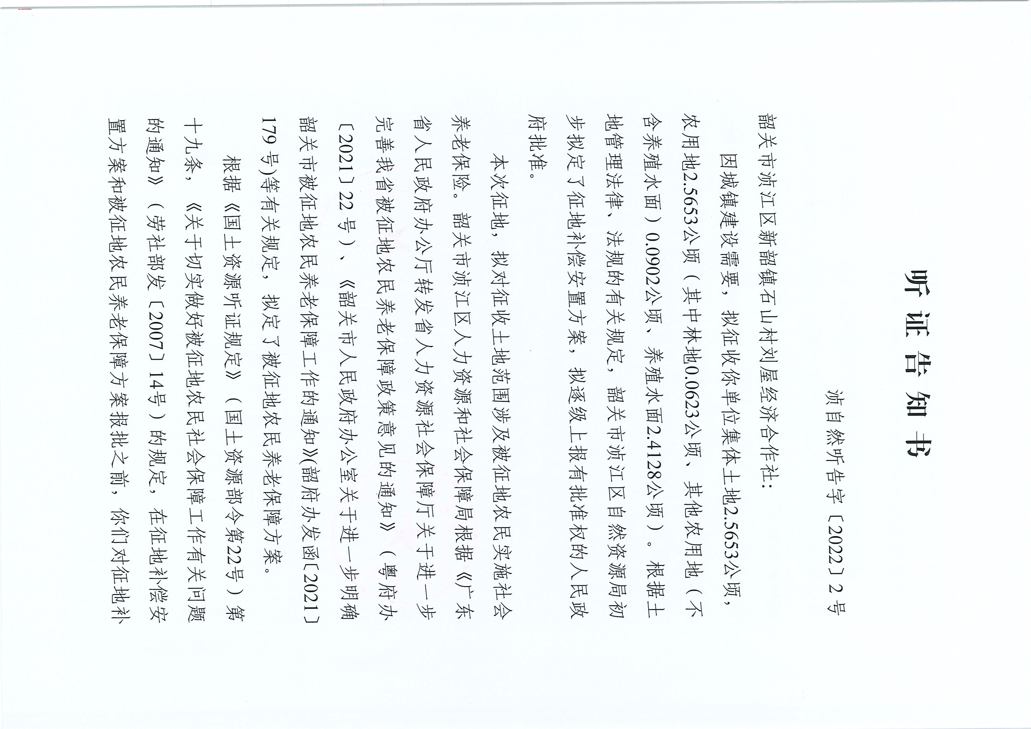 韶关市浈江区2021年度第十三批次城镇建设用地的听证告知书
